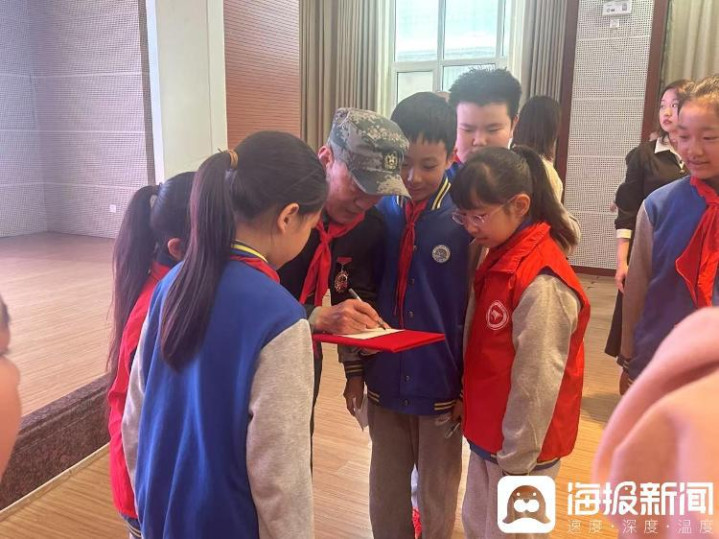 活动现场,两名少先队员表演了快板《思政三字经》,在清脆的竹板声中,“强国有我勇向前”的童声宣言响彻会场。随后,王速成老人为学校“红色基因站”“榜样引领站”“文化传承站”三个特色中队授旗。授旗仪式结束后,王速成老人为同学们生动讲述了红色故事,赢得了在场学生们的阵阵掌声,共同开启了一场别开生面的沉浸式思政教育之旅。